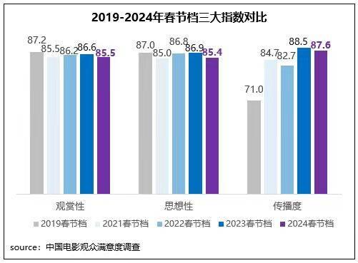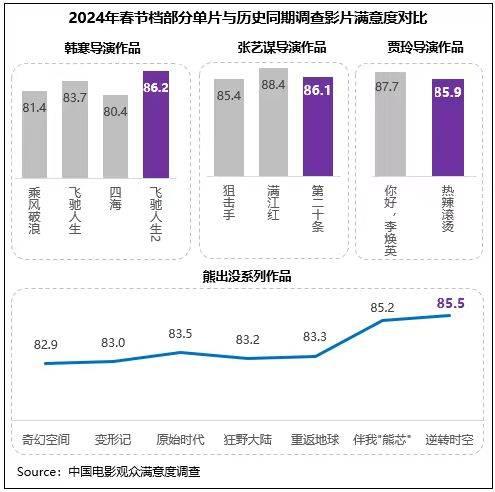 中國電影觀眾滿意度調(diào)查?2024年春節(jié)檔調(diào)查結(jié)果顯示,春節(jié)檔觀眾滿意度得分85.9分,為2015年以來調(diào)查9個(gè)春節(jié)檔的第二名,同時(shí)居歷史調(diào)查各檔期滿意度第四位。檔期調(diào)查的8部影片中有4部超85分(《飛馳人生2》86.2分、《第二十條》86.1分、《熱辣滾燙》85.9分、《熊出沒·逆轉(zhuǎn)時(shí)空》85.5分),數(shù)量和2023年同期持平,均為歷年春節(jié)檔之最。檔期多元化佳作頻出,以優(yōu)質(zhì)創(chuàng)作獲得觀眾高滿意度評價(jià),再度掀起春節(jié)全民觀影熱潮。