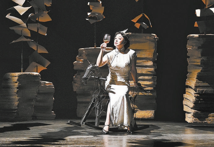 一身華服的陳白露,穿過這鬼魂般的群像,從斜坡上拾階而下,帶著與周遭一切格格不入的方達(dá)生走進(jìn)她的生活。一邊是燈紅酒綠、紙醉金迷的聲色場(chǎng)所,一邊是從天而降、堆疊成摞的書卷與賬單,象征著陳白露生活中并存的浪漫夢(mèng)想和殘酷現(xiàn)實(shí)。還有一個(gè)小搖馬,折射出陳白露并未完全失去天真,但總是搖擺不定的內(nèi)心。陳白露出場(chǎng)的每身服裝,不僅很美,也傳達(dá)著金星對(duì)人物的態(tài)度。從白色的緊身旗袍,到銀色的曳地長(zhǎng)裙,再到赭紅的飄逸長(zhǎng)袍,服裝顏色越來越深,款式卻越來越寬松,讓人能夠更形象地感受到陳白露越來越黯淡的生活和渴望擺脫束縛的靈魂。