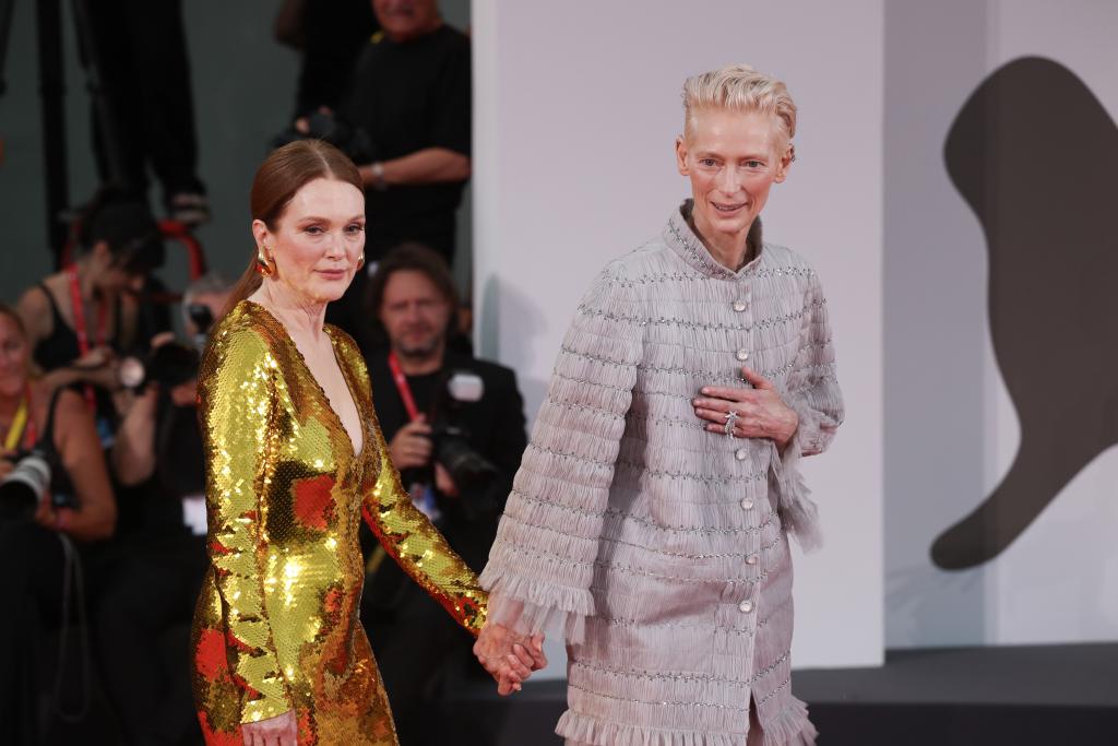 9月2日,在意大利威尼斯舉行的第81屆威尼斯國際電影節(jié)上,主競賽單元影片《隔壁房間》演員朱麗安·摩爾(左)和蒂爾達·斯文頓亮相首映式紅毯。新華社記者 李京 攝