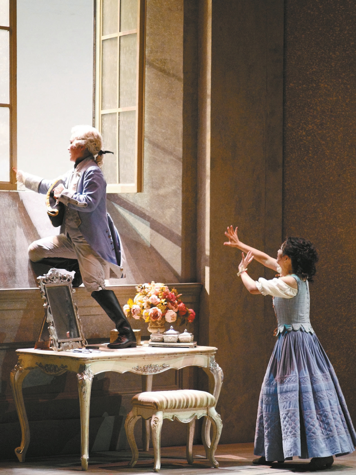 奧地利男中音馬庫斯·維爾巴飾演的費加羅一登場便贏得滿堂喝彩。他以渾厚圓潤的音色與精湛的表演技巧,將這位機智勇敢的男仆形象刻畫得入木三分。在詠嘆調(diào)“如果你想跳舞”中,維爾巴與國家大劇院合唱團的默契配合將劇情推向首個高潮,合唱團飽滿和諧的和聲為音樂增添了絢麗色彩。第一幕結(jié)尾處,維爾巴演唱的著名詠嘆調(diào)“再不要去做情郎”以明快有力的旋律與溫柔勸導(dǎo)的宣敘調(diào)交替呈現(xiàn),生動展現(xiàn)了費加羅幽默風(fēng)趣與堅定勇敢的雙重性格,鏗鏘有力的演唱贏得全場掌聲雷動。