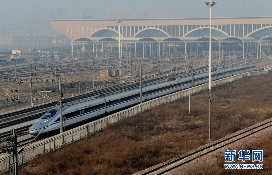 一輛動車組列車駛離石家莊火車站(1月9日攝)。 1月10日零時起,全國鐵路實行新的列車運行圖,增開旅客列車285.5對,其中增開動車組列車281.5對。運行圖調(diào)整后,全國鐵路開行旅客列車總數(shù)達到3142對,其中動車組列車1980.5對。新華社記者 牟宇 攝