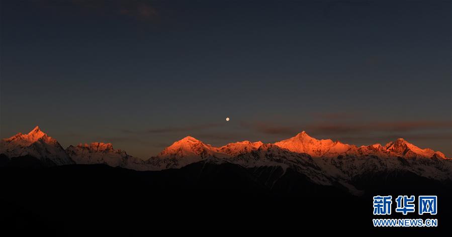 這是3月25日清晨拍攝的梅里雪山“日月同輝”景觀。梅里雪山位于滇藏交界的云南省迪慶藏族自治州德欽縣境內(nèi),是世界自然遺產(chǎn)“三江并流”的主要自然景觀之一。梅里雪山常年云霧籠罩,太陽光只在少數(shù)天晴的清晨照射在雪山頂上,形成絕美的“日照金山”美景。有時(shí)月亮尚未落山,太陽已經(jīng)升起,更是形成了難得一見的梅里雪山“日月同輝”奇觀。新華社記者 王長山 攝