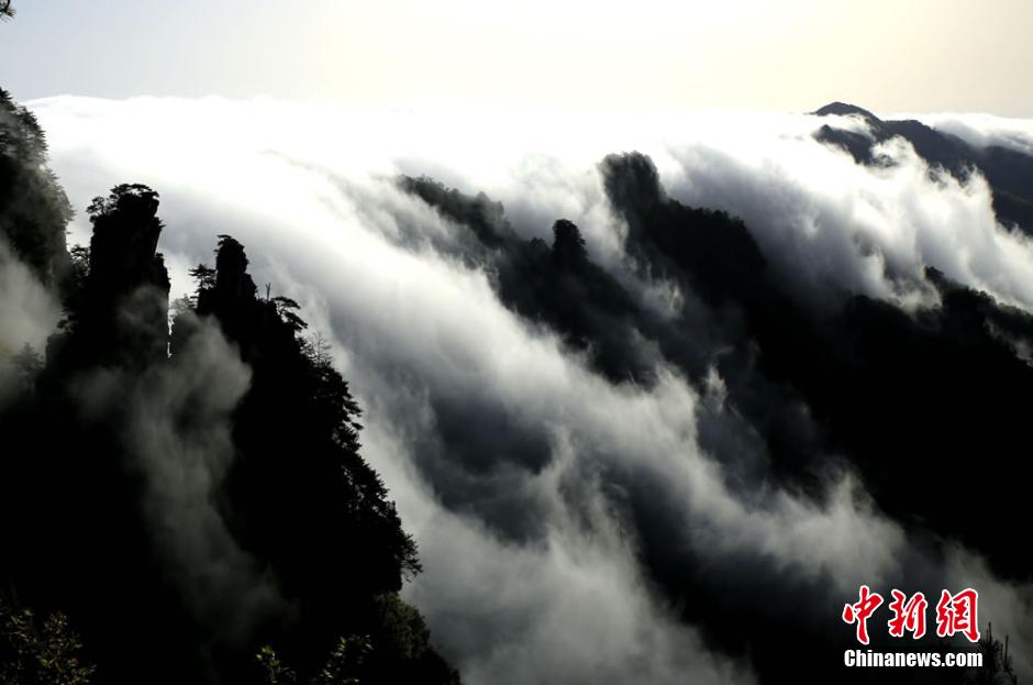 4月18日,雨過天晴的湖南張家界核心景區(qū)武陵源出現(xiàn)壯觀的“云瀑”景觀。雪白的濃云從峰林間向下翻騰,猶如天河傾瀉,氣勢(shì)磅礴。 吳勇兵 攝