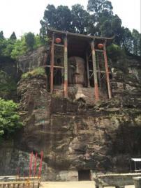 沿石梯而上,一面數(shù)百平米的石壁上,一尊大佛坐西向東,依巖而建。據(jù)測量,大佛高15.85米,寬11米。其中頭高7.7米,面寬4.6米。佛頭之上,一座木質(zhì)廊亭像一把巨傘,為其遮風(fēng)蔽雨。胸側(cè)各站一力士,均高1.9米,腰系裙,穿甲,甲紋似魚鱗,身繞帔帛,立于臺(tái)基上。大佛胸下部分與高聳巖石融為一體,氣勢磅礴。