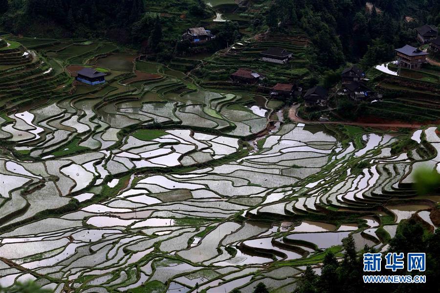 5月20日在廣西柳州市融水苗族自治縣桿洞鄉(xiāng)拍攝的梯田。廣西柳州市融水苗族自治縣桿洞鄉(xiāng)平均海拔780多米,是全縣高海拔鄉(xiāng)鎮(zhèn)之一。這里的梯田多在高山,人們稱之為“天上糧倉”。時(shí)下,“天上糧倉”或儲(chǔ)水待插,或新秧初栽,如織錦一般美不勝收。新華社發(fā)(龍濤 攝)