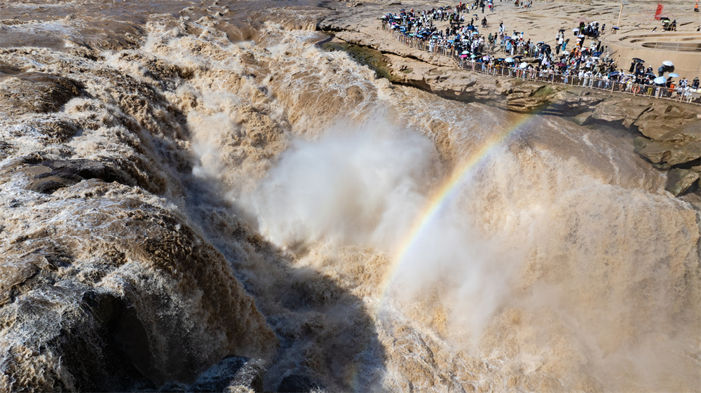 奔騰的黃河壺口瀑布吸引眾多游客前來(lái)觀賞。