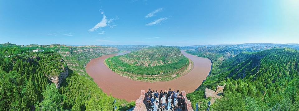 8月19日,游客在永和縣乾坤灣景區(qū)游覽觀光、合影留念。近年來,該縣不斷提高當(dāng)?shù)厣指采w率,并依托紅色旅游資源發(fā)展文旅經(jīng)濟(jì),把東征村156孔窯洞改造成民宿旅館,增加了村集體和村民收入。