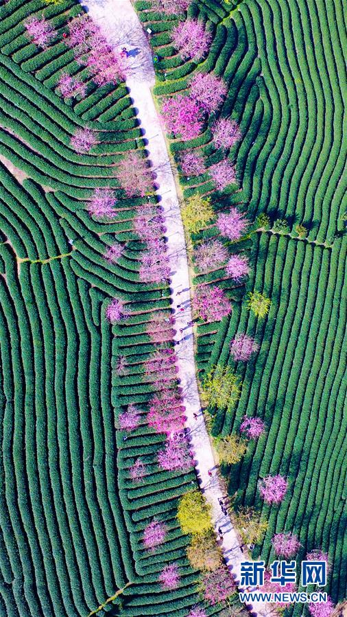 這是2月27日在福建省龍巖市永福鎮(zhèn)航拍的茶園和綻放的櫻花。 近日氣溫轉(zhuǎn)暖,位于福建省龍巖市永福鎮(zhèn)的15萬株櫻花競(jìng)相綻放。新華社發(fā)(李藝爽 攝)