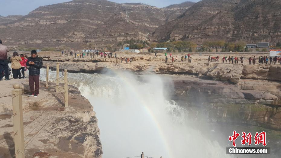 壺口瀑布是中國第二大瀑布,是世界上最大的黃色瀑布。記者20日看到,飛舞的瀑布和河水蕩起浪花,一道彩虹掛在瀑布騰起的飛霧里,讓冬日的壺口多了色彩。 高慶國 攝