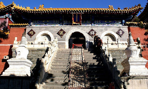 臺(tái)懷鎮(zhèn)鎮(zhèn)北有一小峰,人稱(chēng)靈鷲峰,亦名菩薩頂。所以稱(chēng)之為靈鷲峰,是因?yàn)樗牡乩硇蝿?shì)頗似古印度摩揭陀國(guó)王舍城東北部釋迦牟尼佛說(shuō)法的靈鷲峰故名。據(jù)佛教史籍記載,東漢時(shí)期,我國(guó)佛教最初的傳播人攝摩騰和竺法蘭來(lái)到臺(tái)懷鎮(zhèn),見(jiàn)今菩薩頂?shù)男蝿?shì)頗似印度的靈鷲峰,因而命名之。所以也稱(chēng)靈鷲峰為菩薩頂,佛教徒傳說(shuō)文殊菩薩曾在峰頂顯靈和說(shuō)法。