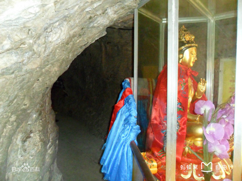 千佛洞,分內(nèi)外兩洞,外洞大而明,內(nèi)洞小而幽,中間有一個扁圓形孔穴相通。內(nèi)洞中,可以容納五至七人。內(nèi)洞的洞壁上,山巖經(jīng)水溶化,產(chǎn)生許多乳石及石筍,夾有各種色質(zhì),猶如人體心肝五臟,洞形又呈葫蘆形狀,后人便稱之為母腹。佛教宣揚進入小洞就是投胎佛母,受其恩育,復(fù)出小洞就是洗掉人生一切煩惱,獲得無上歡樂幸福。