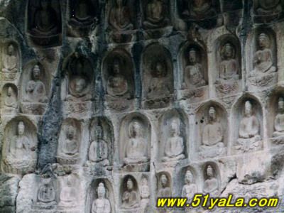 千佛崖在山西霍縣南7.5公里郭莊村山腰。山巒聳峙,山花爛漫,摩崖造像隱現(xiàn)其間。始刻于唐代,宋、元時屢有造鑿,直至明正德五年(1501年)始結(jié)束。本尊大佛高約8米,下部刻有唐貞觀以及天寶五年(公元746年)、長慶二年(822年)等題記。千手千眼觀音像高約2米,為元代所造。其余小佛多為三軀一組(一佛二菩薩或一佛二弟子),亦有單佛一龕者,刻工精湛,造型生動,極富民間特色。