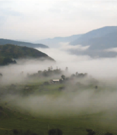 炊煙裊裊的村莊,偷偷地從薄霧里露出惺忪的臉來,時隱時現,猶如傳說中的蓬萊仙島。一個個白族村莊沉浸在美輪美奐的仙境之中,整個峽谷布滿著一幅幅精美絕倫的淡墨山水畫??上У氖谴逯械娜藗冞€未品嘗出做神仙的滋味,霧海就隨著江面吹來的西風越升越高,不一會兒,就向羅平山頂飄襲而來。我們幾個觀霧者迅即被淹沒在濃濃的云山霧海中,成了騰云駕霧的神仙了。遺憾的是我們還未過足神仙癮,那些飄蕩在山頂的云霧就被熱烈而耀眼的太陽光收回去了,讓我們不得不回到人間,仍去做原來的凡夫俗子。