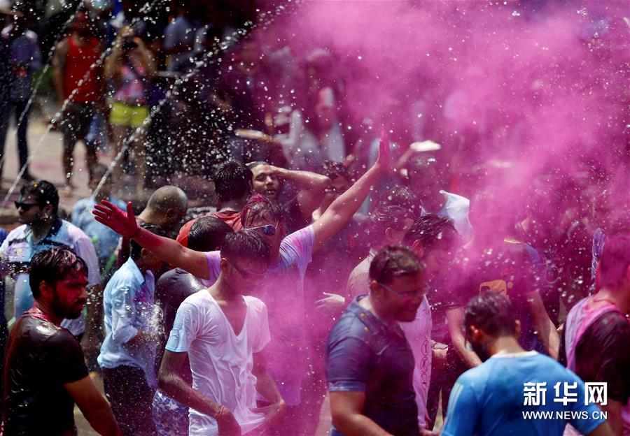 胡里節(jié)也叫“灑紅節(jié)”,人們?cè)谧约耗樕虾蜕砩贤可项伭?,還向別人拋撒五顏六色的顏料和粉末,迎接春天的到來。新華社發(fā)(吳昂 攝)