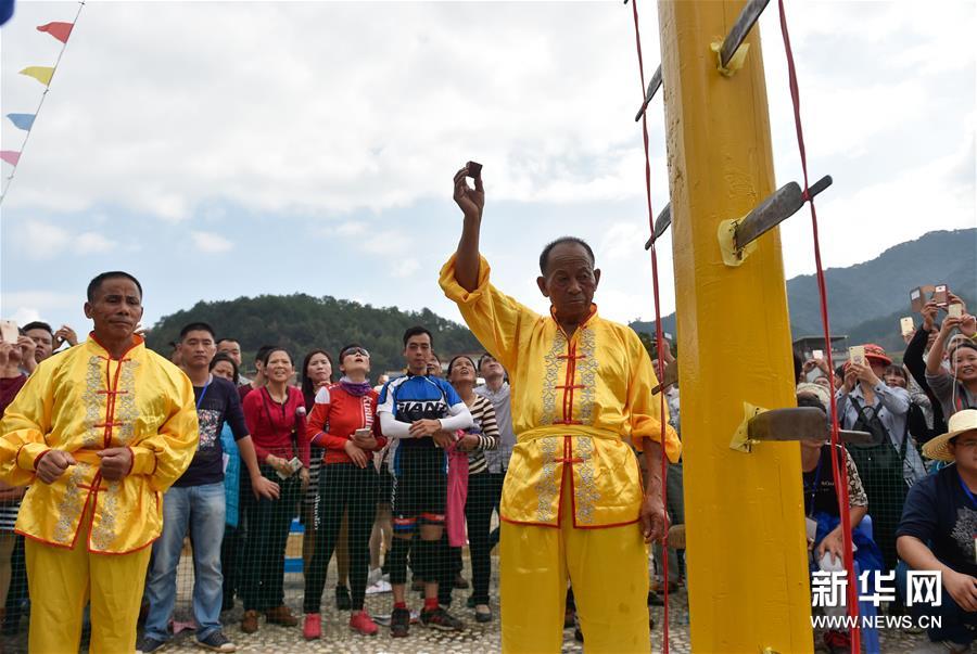 農(nóng)歷十月十五前后,福建西部武平縣各山村陸續(xù)進(jìn)入農(nóng)閑時節(jié)。按照當(dāng)?shù)仫L(fēng)俗,不同村子各自擇日舉辦民間活動,其中較有代表性的就是“上刀山”絕技?!吧系渡健苯^技在閩西山村流傳已有數(shù)百年歷史,表演者需光腳順著磨得鋒利閃亮的36把鋼刀,攀登至8米高的杉木柱子頂部,接受長者祝福,祈求風(fēng)調(diào)雨順、五谷豐登。新華社記者 宋為偉 攝