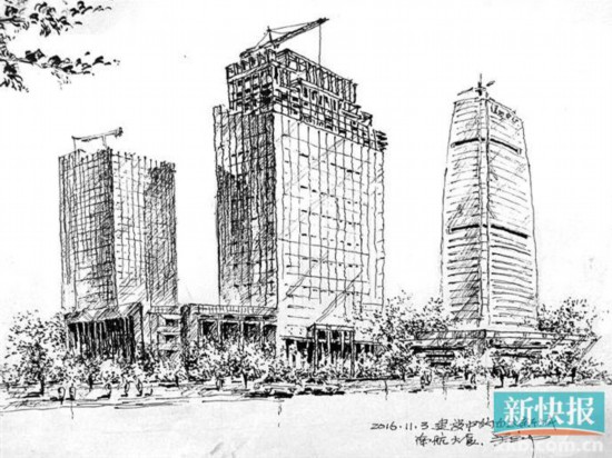 “以前工作日需要上班,我就利用周末在街巷間走動,看到地標建筑就開始畫。遇到正在施工的高樓,我就計算著日子,到高樓即將封頂?shù)臅r候,我就帶上紙筆到施工現(xiàn)場畫畫。”吳立中介紹。