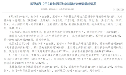 情況顯示,截至8月10日24時(shí),據(jù)31個(gè)?。ㄗ灾螀^(qū)、直轄市)和新疆生產(chǎn)建設(shè)兵團(tuán)報(bào)告,現(xiàn)有確診病例794例(其中重癥病例44例),累計(jì)治愈出院病例79284例,累計(jì)死亡病例4634例,累計(jì)報(bào)告確診病例84712例,現(xiàn)有疑似病例3例。累計(jì)追蹤到密切接觸者802273人,尚在醫(yī)學(xué)觀察的密切接觸者23790人。