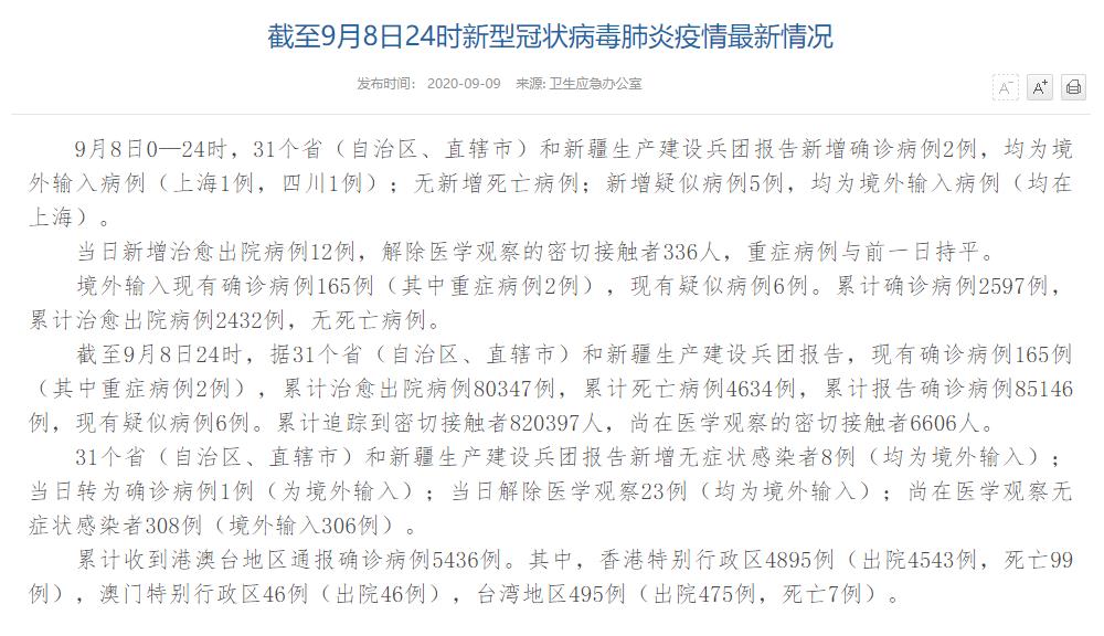 情況顯示,截至9月8日24時,據(jù)31個省(自治區(qū)、直轄市)和新疆生產(chǎn)建設(shè)兵團報告,現(xiàn)有確診病例165例(其中重癥病例2例),累計治愈出院病例80347例,累計死亡病例4634例,累計報告確診病例85146例,現(xiàn)有疑似病例6例。累計追蹤到密切接觸者820397人,尚在醫(yī)學觀察的密切接觸者6606人。