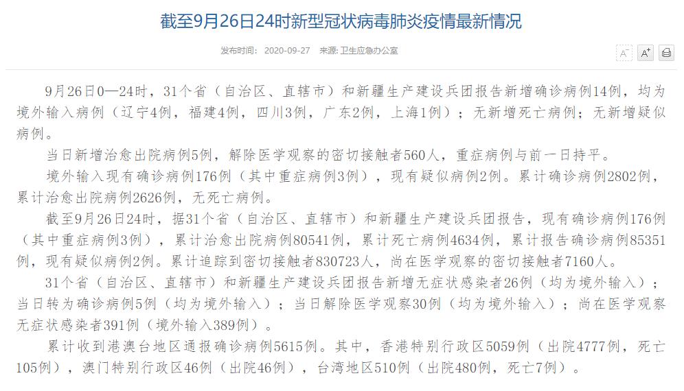 人民網(wǎng)北京9月27日電(董童)國(guó)家衛(wèi)生健康委于今日在官網(wǎng)發(fā)布的《截至9月26日24時(shí)新型冠狀病毒肺炎疫情最新情況》(以下簡(jiǎn)稱“情況”)提出,9月26日0—24時(shí),31個(gè)?。ㄗ灾螀^(qū)、直轄市)和新疆生產(chǎn)建設(shè)兵團(tuán)報(bào)告新增確診病例14例,均為境外輸入病例(遼寧4例,福建4例,四川3例,廣東2例,上海1例);無(wú)新增死亡病例;無(wú)新增疑似病例。當(dāng)日新增治愈出院病例5例,解除醫(yī)學(xué)觀察的密切接觸者560人,重癥病例與前一日持平。