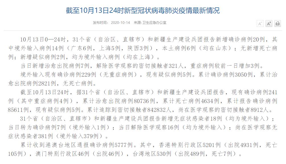 人民網(wǎng)北京10月14日電(董童)國家衛(wèi)生健康委于今日在官網(wǎng)發(fā)布的《截至10月13日24時新型冠狀病毒肺炎疫情最新情況》(以下簡稱“情況”)稱,10月13日0—24時,31個?。ㄗ灾螀^(qū)、直轄市)和新疆生產(chǎn)建設(shè)兵團(tuán)報告新增確診病例20例,其中境外輸入病例14例(廣東6例,上海5例,陜西3例),本土病例6例(均在山東);無新增死亡病例;新增疑似病例2例,均為境外輸入病例(均在上海)。當(dāng)日新增治愈出院病例7例,解除醫(yī)學(xué)觀察的密切接觸者321人,重癥病例較前一日增加3例。