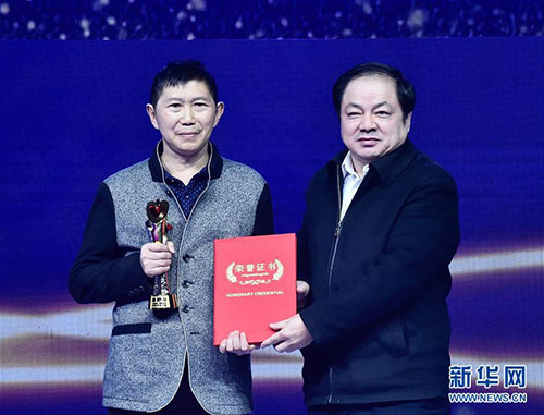 1月18日,“粉筆畫老師”張舉文(左)上臺領(lǐng)獎。當(dāng)日,新華社主辦的“中國網(wǎng)事·感動2018”年度頒獎典禮在中國傳媒大學(xué)舉行,10位“草根”成為舞臺上最閃亮的明星。新華社記者 李賀 攝