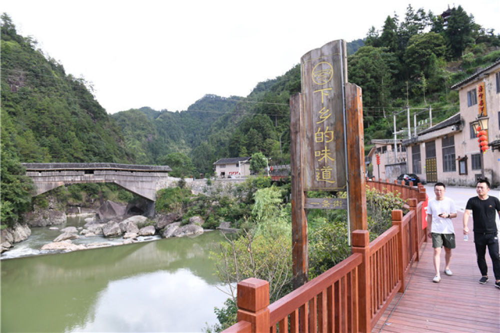 下黨村新修的木棧道旁樹(shù)立了“下鄉(xiāng)的味道”品牌標(biāo)識(shí)(8月8日攝)。新華社記者 林善傳 攝