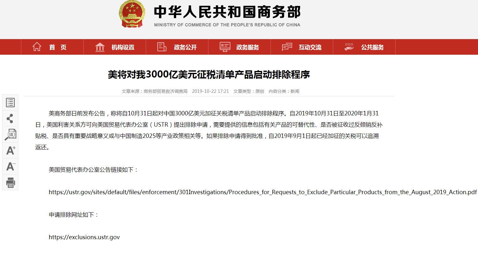 人民網(wǎng)北京10月23日電 據(jù)商務(wù)部網(wǎng)站消息,美商務(wù)部日前發(fā)布公告,稱將自10月31日起對(duì)中國(guó)3000億美元加征關(guān)稅清單產(chǎn)品啟動(dòng)排除程序。自2019年10月31日至2020年1月31日,美國(guó)利害關(guān)系方可向美國(guó)貿(mào)易代表辦公室(USTR)提出排除申請(qǐng),需要提供的信息包括有關(guān)產(chǎn)品的可替代性、是否被征收過(guò)反傾銷反補(bǔ)貼稅、是否具有重要戰(zhàn)略意義或與中國(guó)制造2025等產(chǎn)業(yè)政策相關(guān)等。如果排除申請(qǐng)得到批準(zhǔn),自2019年9月1日起已經(jīng)加征的關(guān)稅可以追溯返還。