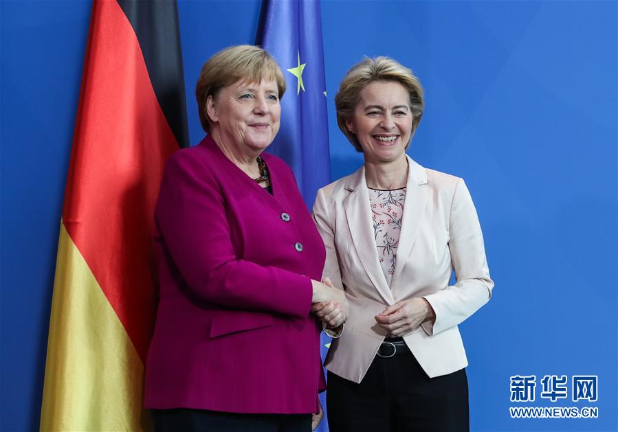 11月8日,在德國(guó)首都柏林的總理府,德國(guó)總理默克爾(左)和來(lái)訪的歐盟委員會(huì)當(dāng)選主席馮德萊恩出席聯(lián)合記者會(huì)后合影。新華社記者單宇琦攝