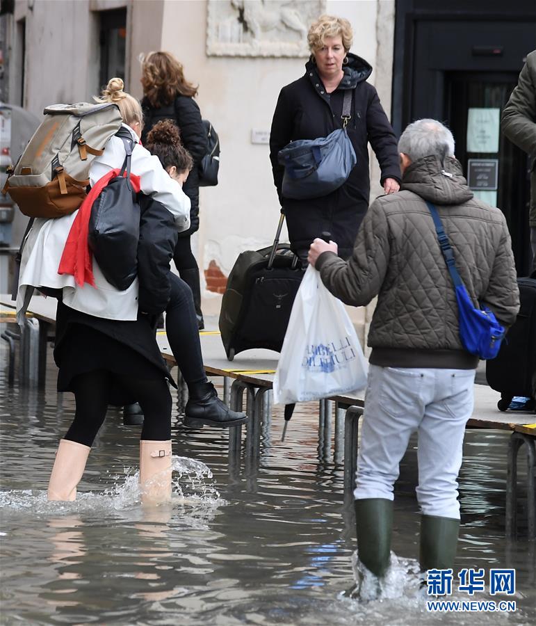 11月17日,在意大利威尼斯,人們涉水出行。新華社發(fā)(埃莉薩·林格里亞攝)