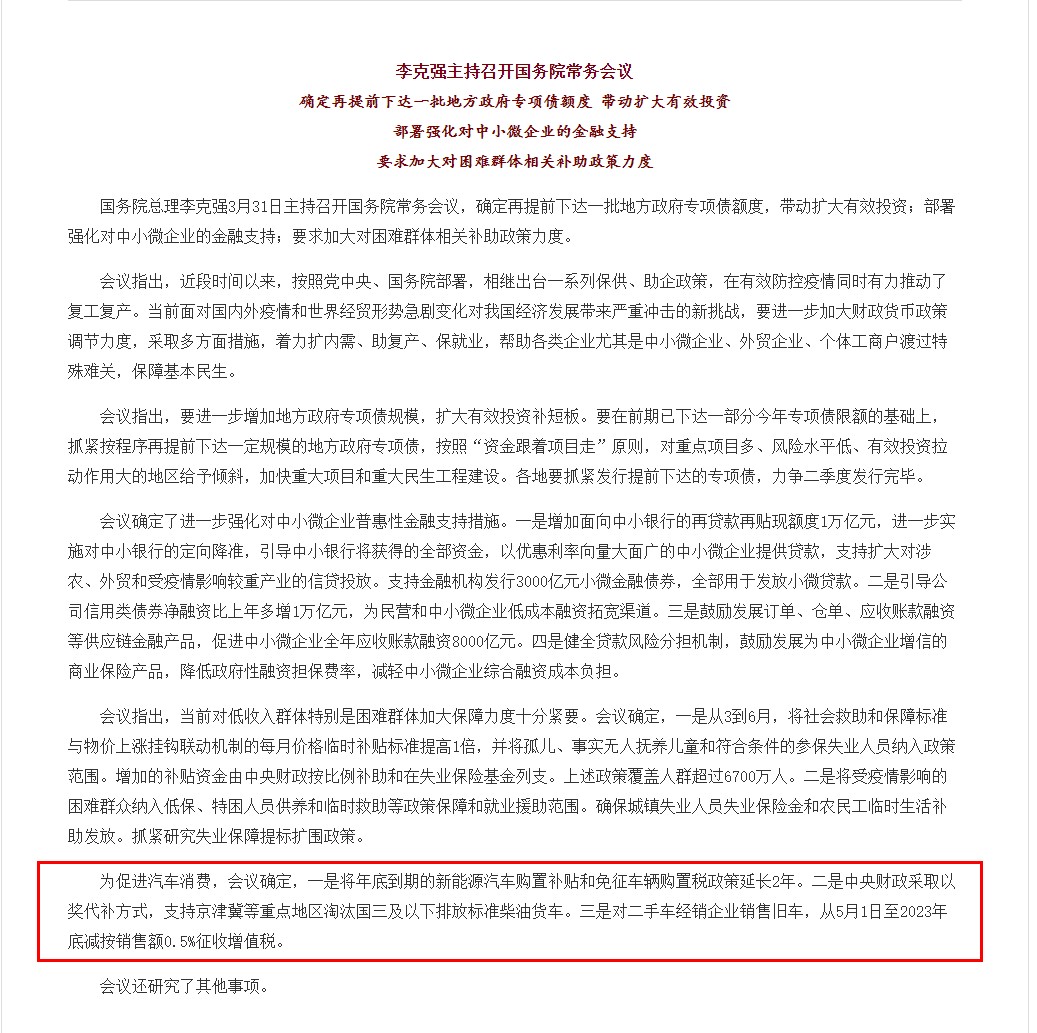 人民網(wǎng)北京3月31日電(鄂智超)在3月31日召開的國務(wù)院常務(wù)會議上,確定了對于促進(jìn)汽車消費的三點新舉措,其中,將年底到期的新能源車補(bǔ)貼和免征購置稅政策延長2年。此外,中央財政采取以獎代補(bǔ)方式,支持京津冀等重點地區(qū)淘汰國三及以下排放標(biāo)準(zhǔn)柴油貨車。對二手車經(jīng)銷企業(yè)銷售舊車,從5月1日至2023年底減按銷售額0.5%征收增值稅。