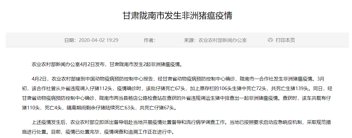 4月2日,農(nóng)業(yè)農(nóng)村部接到中國動物疫病預(yù)防控制中心報告,經(jīng)甘肅省動物疫病預(yù)防控制中心確診,隴南市一合作社發(fā)生非洲豬瘟疫情。3月初,該合作社曾從外省違規(guī)調(diào)入仔豬112頭,疫情確診時,該批仔豬死亡67頭,加上原存欄的106頭生豬中死亡72頭,共死亡生豬139頭。同日,經(jīng)甘肅省動物疫病預(yù)防控制中心確診,隴南市兩當(dāng)縣楊店公路檢查站在查獲的外省違規(guī)調(diào)運(yùn)生豬中排查出一起非洲豬瘟疫情。查獲時,該車共載有仔豬110頭,死亡4頭,隔離期間剩余仔豬陸續(xù)死亡63頭,共死亡仔豬67頭。