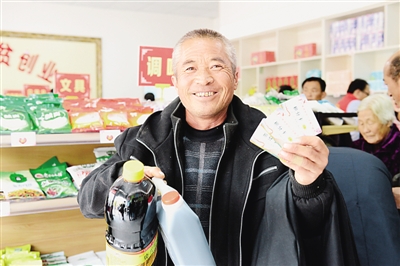 山西呂梁石樓縣義碟鎮(zhèn)下河村貧困戶焦三喜領(lǐng)到扶貧積分卡,憑積分卡可以到扶貧超市兌換日常生活用品。資料圖片