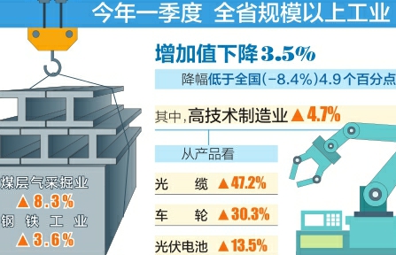 一季度,全省規(guī)模以上工業(yè)增加值下降3.5%,降幅低于全國(guó)4.9個(gè)百分點(diǎn);高技術(shù)制造業(yè)增長(zhǎng)4.7%