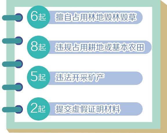 有5起違法開采礦產(chǎn):包括河南省南陽市南召縣達康實業(yè)發(fā)展有限公司以設(shè)施農(nóng)業(yè)為名違法開采砂石37萬噸;廣西壯族自治區(qū)北流市委、市政府主導推動以工程建設(shè)項目施工名義違法開采砂石土等。另有2起提交虛假證明材料等違法違規(guī)行為。