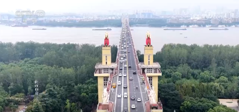 在江蘇南京,南京長江大橋裝扮一新,喜迎國慶。公路橋橋頭堡周邊安排了花卉布展?;▔渣S色孔雀草為背景,明亮耀眼,搭配一串紅組成的紅色花卉飄帶,烘托出喜慶的節(jié)日氛圍。