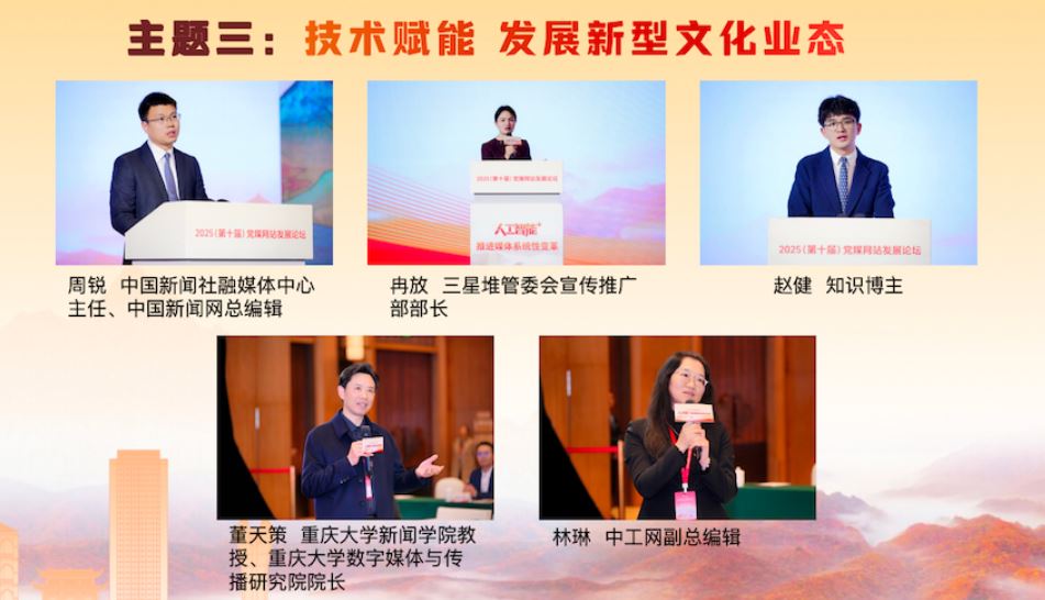在“技術(shù)賦能 發(fā)展新型文化業(yè)態(tài)”主題研討環(huán)節(jié),中國新聞社融媒體中心主任、中國新聞網(wǎng)總編輯周銳,三星堆管委會宣傳推廣部部長冉放,知識博主趙健,分別就技術(shù)賦能中華文化“破圈”出海、三星堆文化傳播數(shù)智實踐、短視頻文化傳播等方面的經(jīng)驗成果進(jìn)行了精彩展示。重慶大學(xué)新聞學(xué)院教授、重慶大學(xué)數(shù)字媒體與傳播研究院院長董天策,中工網(wǎng)副總編輯林琳作為互動嘉賓進(jìn)行了點評,期待主流媒體發(fā)揮傳播實踐智慧,在內(nèi)容、技術(shù)和社會責(zé)任之間找到平衡,鑄造中華文化新輝煌。
