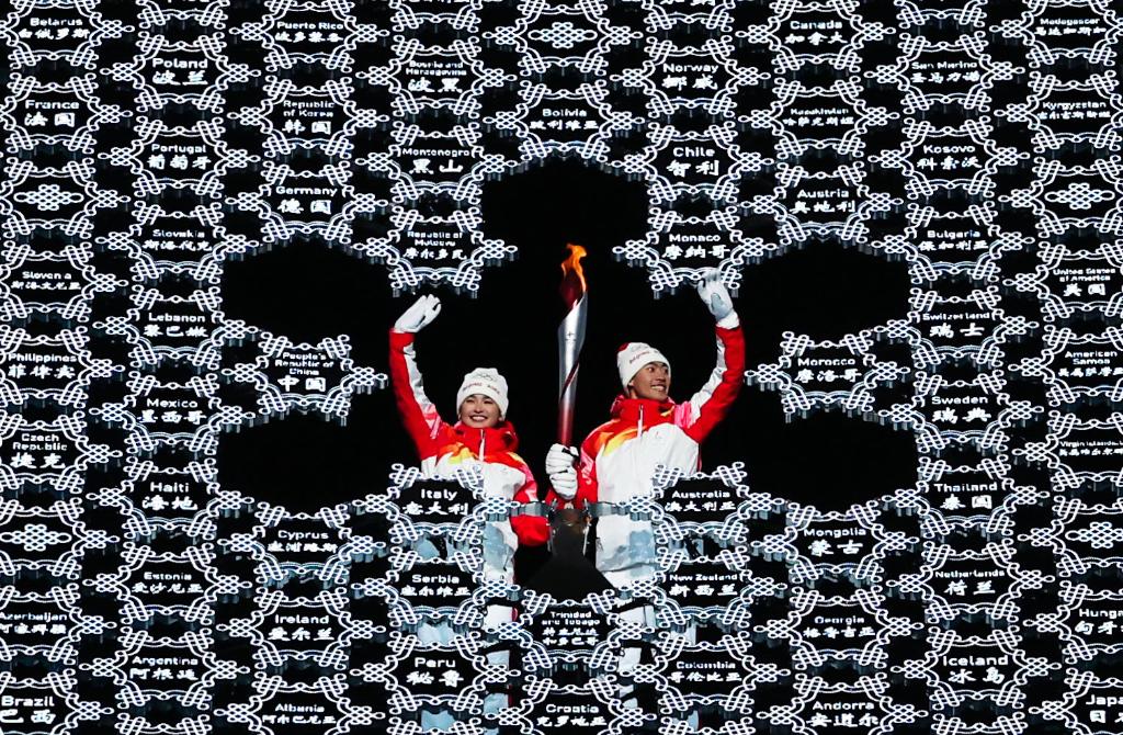 2022年2月4日晚,第二十四屆冬季奧林匹克運動會開幕式在北京國家體育場舉行。這是最后一棒火炬手迪妮格爾·衣拉木江和趙嘉文(右)。新華社記者 曹燦 攝