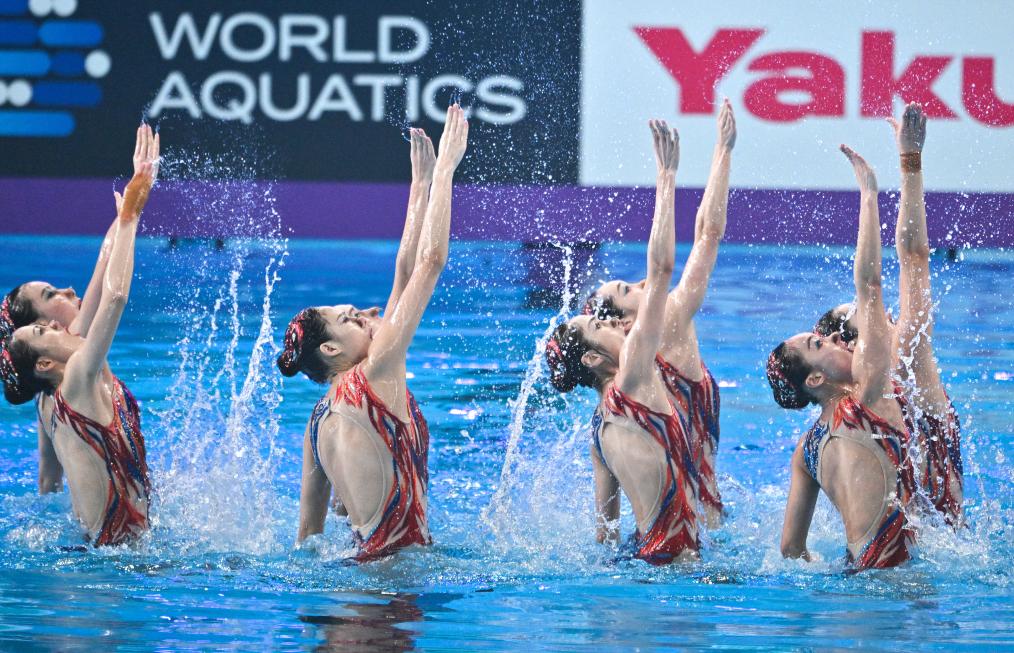 2月6日,陳芋汐(左)/全紅嬋在比賽中。新華社記者 雒圓 攝 花樣游泳集體技術(shù)自選決賽中,作為預(yù)賽第一名的中國隊最后出場,以一套主題為《速度與激情》的動作再次征服裁判,得到全場最高的299.8712分,力壓西班牙隊和日本隊摘金。這是中國花游隊在本屆世錦賽上的第四枚金牌。女單自由自選決賽中,徐匯妍最終名列第四名,與獎牌擦肩。