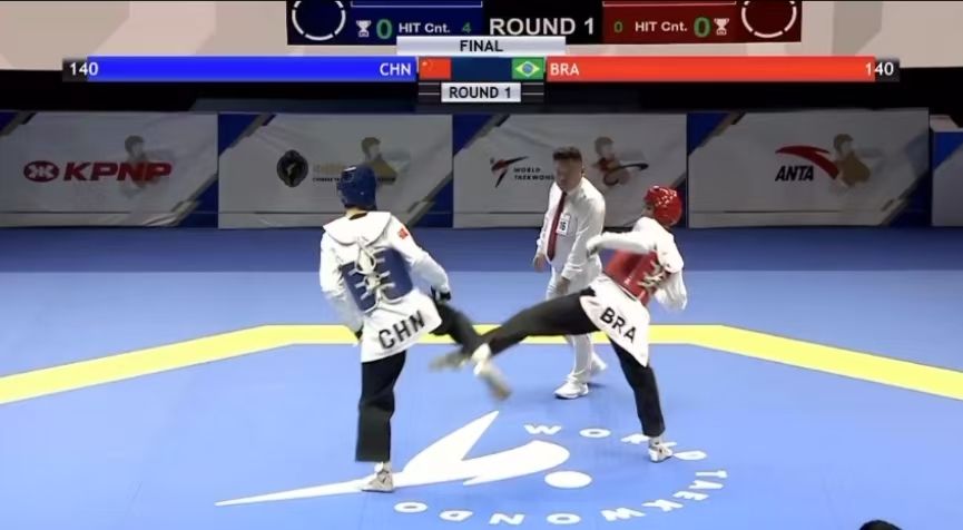 決賽首局比賽,中國隊肖樹楠以一個腹部踢擊得分加對手出界拉開分差,占據(jù)優(yōu)勢后中國隊持續(xù)迎擊,以能量值130:70獲勝。第二局中國隊開場防守松懈,被扣掉40分(能量值),盡管后程中國隊加強攻勢,還是以能量值65:75不敵對手。在決勝局中,巴西隊兩記直拳打開局面,能量值占優(yōu),此后雖然巴西隊兩次被判消極進攻,但中國隊未能把握住機會,最終以能量值110:115輸?shù)舻谌郑蟊确?:2告負(fù)。