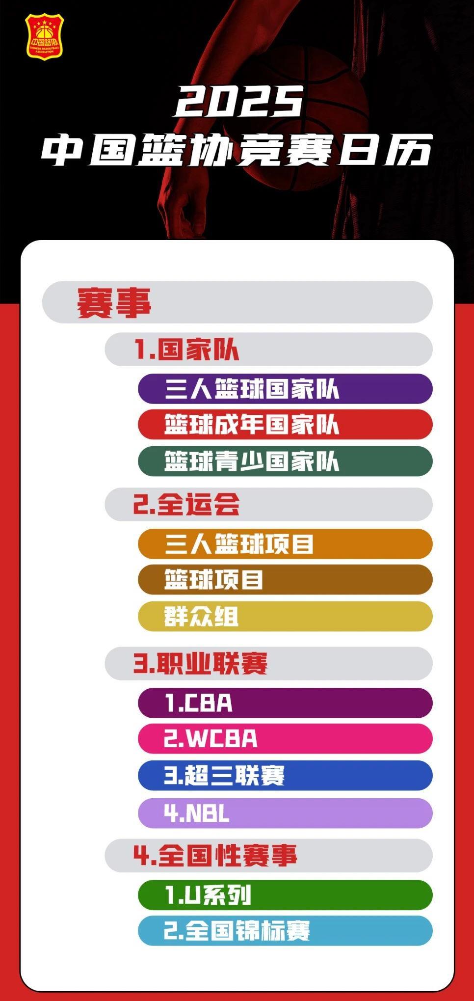 日前,中國籃球協(xié)會(huì)發(fā)布2025年的競賽日歷,所有賽事按照編排賽歷時(shí)的優(yōu)先程度分為5個(gè)層級,包括各級國際比賽、職業(yè)聯(lián)賽等。中國籃協(xié)相關(guān)人士表示,這次對外公布的只是前四個(gè)層級的已確定賽事。中國籃協(xié)和學(xué)體聯(lián)聯(lián)合主辦的一些教育系統(tǒng)的賽事屬于第五個(gè)層級,待有關(guān)細(xì)節(jié)確定后也會(huì)公布。
