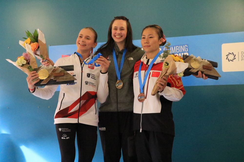 女子前三名在頒獎儀式上,右一為鄧麗娟。中國國家攀巖隊(duì)供圖