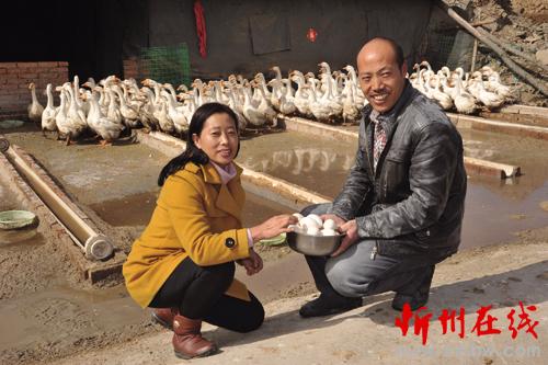 飼養(yǎng)蛋鵝農(nóng)民收獲鵝蛋時的激動