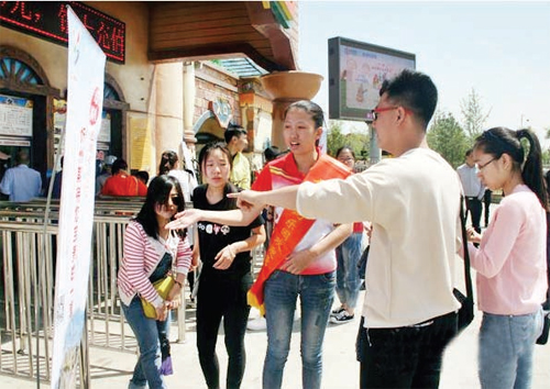 會(huì)后,工作人員在景區(qū)內(nèi)張貼了忻州申辦“2016年山西省旅游發(fā)展大會(huì)”投票海報(bào),并為游客講解活動(dòng)內(nèi)容及投票方法,倡導(dǎo)人人助力、人人投票。圖為工作人員為游客講解投票事宜(忻仁)