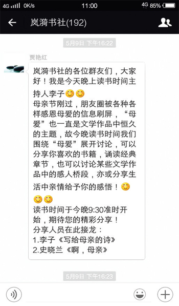 “交流、集體讀書,都是為了讓大家重新找回讀書的感覺,如果大家都讀起書來,我們就達(dá)到基本的目的了。所以在讀書這件事上,從形式到內(nèi)容都不做太多要求。只要讀起書來,參與進(jìn)來就好,在讀書會讓大家感到的不是約束,而是心靈的放松??梢赃@么說,讓讀書回歸到讀書本身,就是生命成長和完善的需要?!碧锴呙酚芍缘卣f。