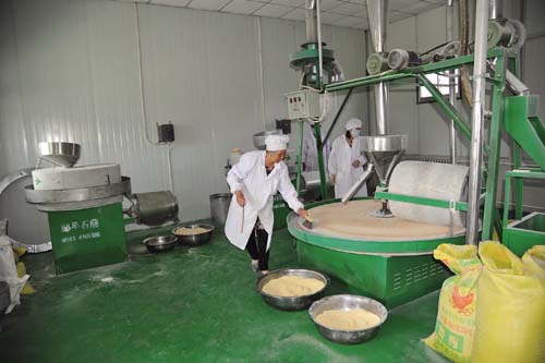 代縣景坤大地貿易有限公司于去年6 月份開始用石碾石磨加工生產小麥面粉、黃米面粉、小米和小雜糧調理面粉等。由于所加工生產的糧食均經過篩選、清洗、甩干,再加之精碾細磨、綠色有機、營養(yǎng)豐富、原汁原味,不添加任何添加劑,深受大城市市民的歡迎,供不應求,成為搶手貨?,F(xiàn)已銷往北京、太原等地。(石俊文 劉睿 攝影報道)