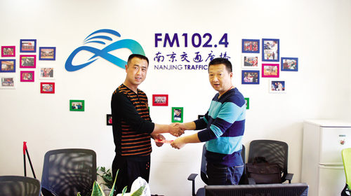 4月7日,在南京交通廣播“智勇在線”節(jié)目組,來自忻州市定襄縣的智杰(左)和主持人智勇在一起,并受到了該媒體的贊譽(yù)與獎(jiǎng)勵(lì)(劉捷 攝)