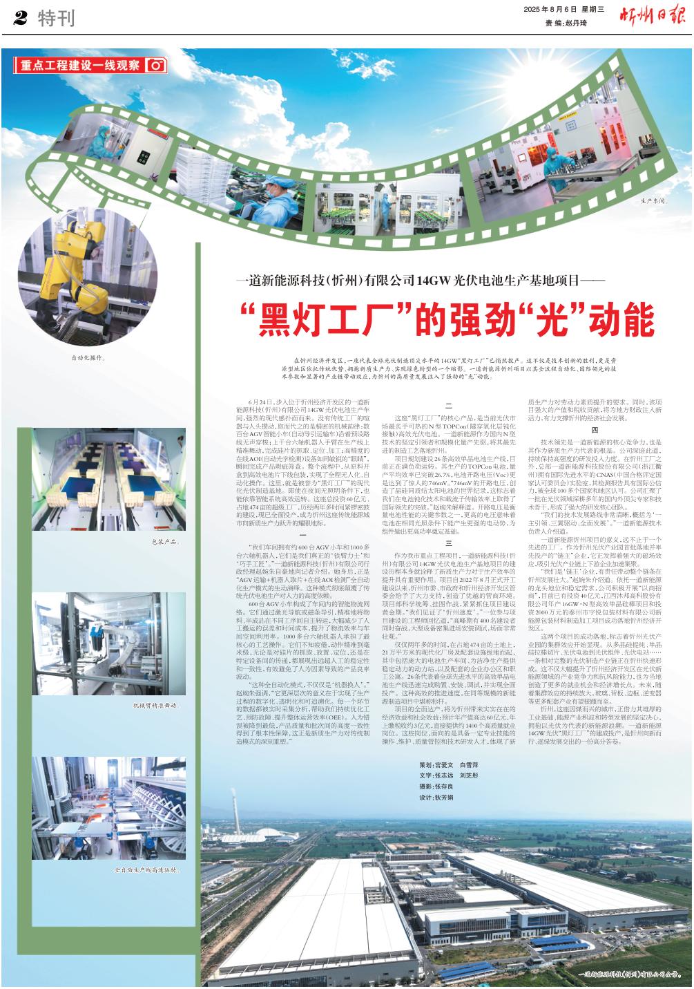 6月24日,步入位于忻州經(jīng)濟(jì)開發(fā)區(qū)的一道新能源科技(忻州)有限公司14GW光伏電池生產(chǎn)車間,強(qiáng)烈的現(xiàn)代感撲面而來(lái)。沒有傳統(tǒng)工廠的喧囂與人頭攢動(dòng),取而代之的是精密的機(jī)械韻律:數(shù)百臺(tái)AGV智能小車(自動(dòng)導(dǎo)引運(yùn)輸車)沿著預(yù)設(shè)路線無(wú)聲穿梭;上千臺(tái)六軸機(jī)器人手臂在生產(chǎn)線上精準(zhǔn)舞動(dòng),完成硅片的抓取、定位、加工;高精度的在線AOI(自動(dòng)光學(xué)檢測(cè))設(shè)備如同敏銳的“眼睛”,瞬間完成產(chǎn)品瑕疵篩查。整個(gè)流程中,從原料開盒到高效電池片下線包裝,實(shí)現(xiàn)了全程無(wú)人化、自動(dòng)化操作。這里,就是被譽(yù)為“黑燈工廠”的現(xiàn)代化光伏制造基地。即使在夜間無(wú)照明條件下,也能依靠智能系統(tǒng)高效運(yùn)轉(zhuǎn)。這座總投資60億元、占地474畝的超級(jí)工廠,歷經(jīng)兩年多時(shí)間緊鑼密鼓的建設(shè),現(xiàn)已全面投產(chǎn),成為忻州這座傳統(tǒng)能源城市向新質(zhì)生產(chǎn)力躍升的耀眼地標(biāo)。