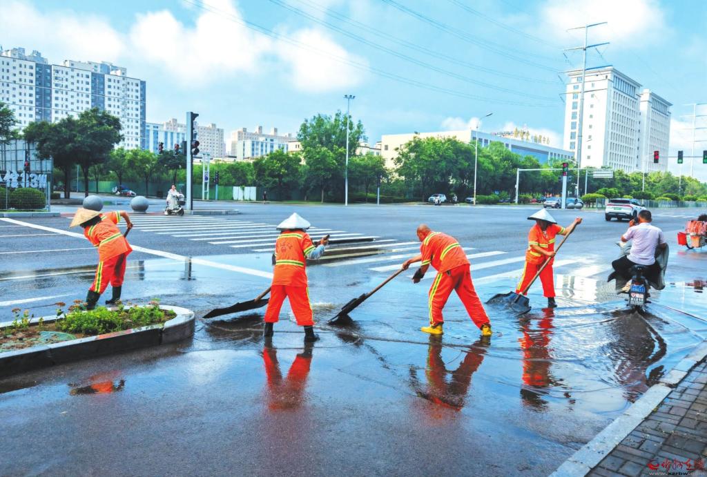 8月5日凌晨,我市降雨天氣造成城區(qū)部分道路路面積水。清晨,環(huán)衛(wèi)工人積極應(yīng)對(duì)雨情,對(duì)轄區(qū)內(nèi)路段開(kāi)展排水清淤工作,保障市民日常出行。圖為環(huán)衛(wèi)工人在紫檀街路口清理積水。本報(bào)記者王陽(yáng)攝