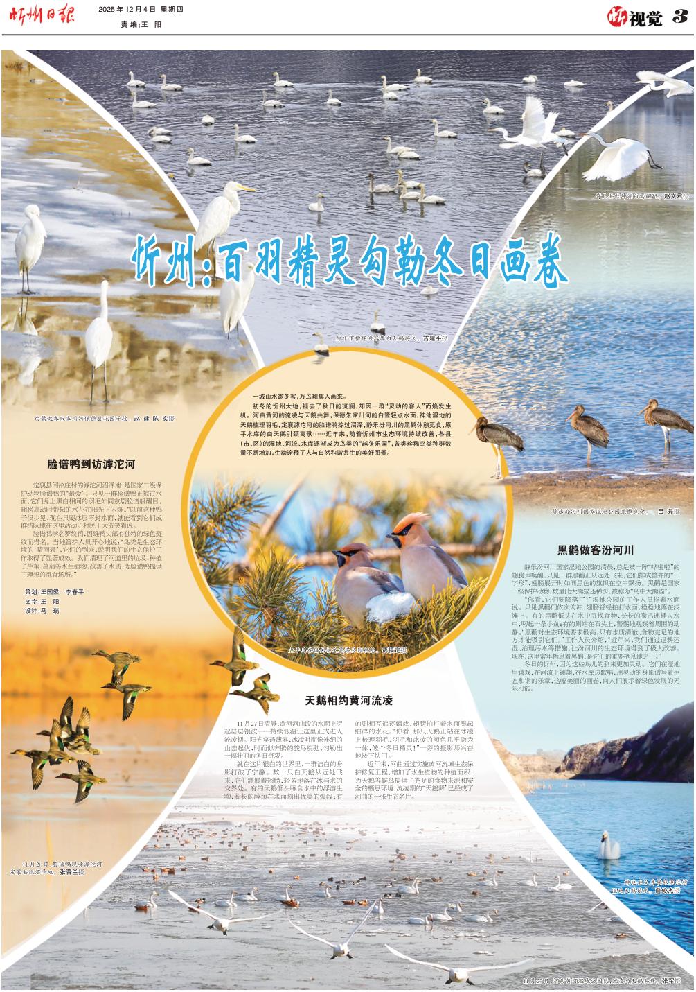 初冬的忻州大地,褪去了秋日的斑斕,卻因一群“靈動的客人”而煥發(fā)生機。河曲黃河的流凌與天鵝共舞,保德朱家川河的白鷺輕點水面,神池濕地的天鵝梳理羽毛,定襄滹沱河的臉譜鴨掠過沼澤,靜樂汾河川的黑鸛休憩覓食,原平水庫的白天鵝引頸高歌……近年來,隨著忻州市生態(tài)環(huán)境持續(xù)改善,各縣(市、區(qū))的濕地、河流、水庫逐漸成為鳥類的“越冬樂園”,各類珍稀鳥類種群數(shù)量不斷增加,生動詮釋了人與自然和諧共生的美好圖景。