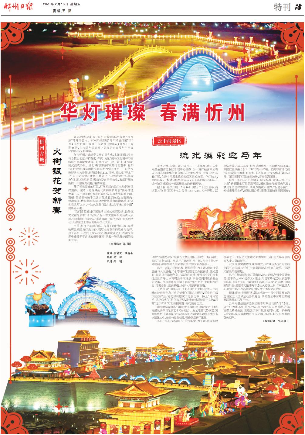 目前,燈展已璀璨啟幕。夜幕下的忻州古城,城墻輪廓已被暖黃燈光勾勒,花燈點(diǎn)亮節(jié)日的浪漫與吉祥。這個(gè)春節(jié),不妨約上家人好友,漫步城墻之上,在流光溢彩中感受千年古城的新春脈動(dòng),共赴一場(chǎng)浪漫熱鬧的光影之約。(本報(bào)記者王陽)